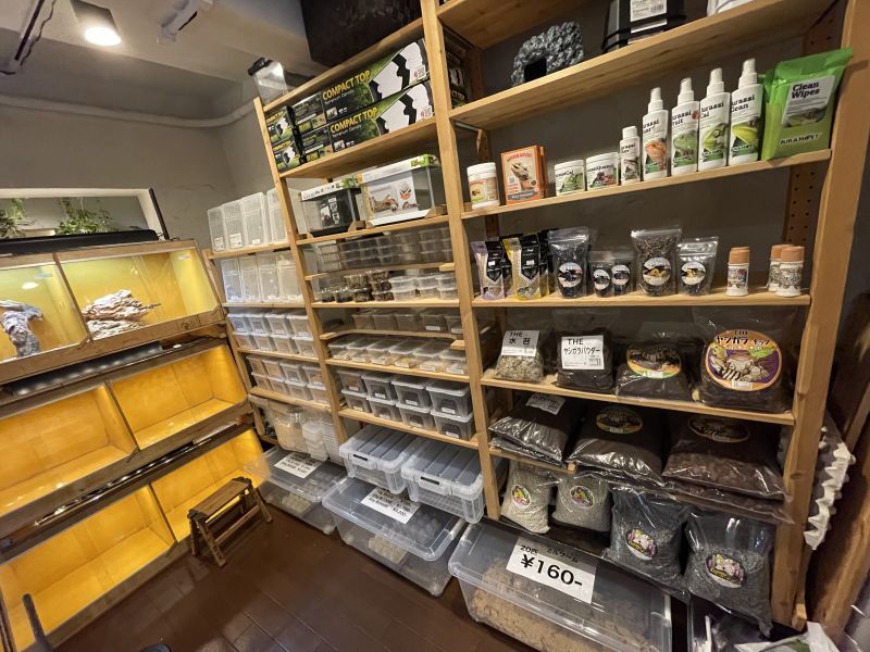 生体や餌(コオロギや人口飼料)、飼育用具だけでなくアクセサリーも販売しています。